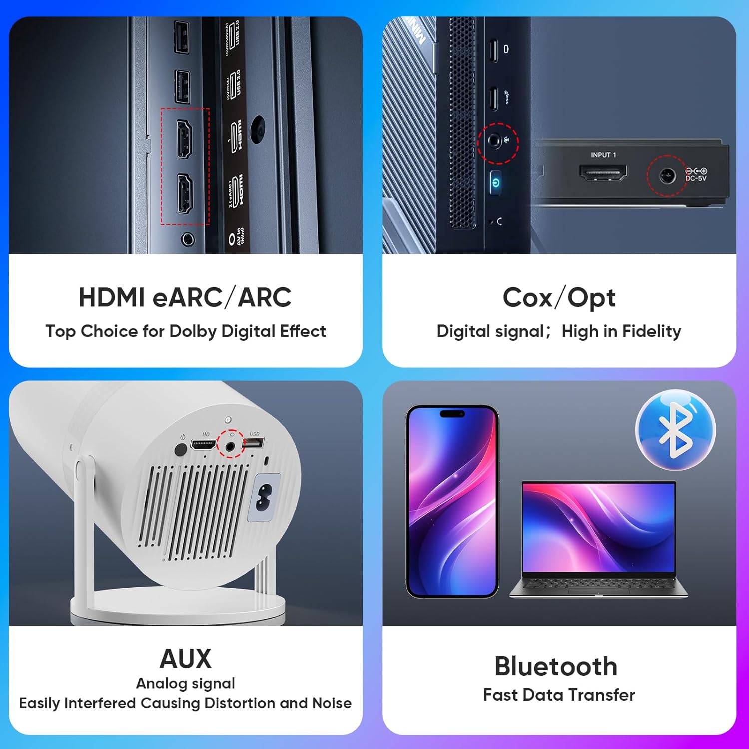 eARC/ARC: Top audio effectsOpt/Cox: Digital, high – fidelityAux: Analog, distorts & noisy